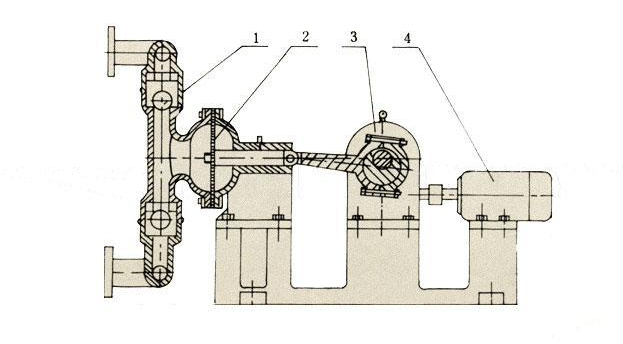 电机(4)通过减速箱(3)带动左右两端柱塞上面的隔膜(2)一前一后往复运动。在左右两个泵腔内,装有上下四个单向球阀(1)隔膜的运动,造成工作腔内的容积的改变,迫使四个单向球阀交替地开启和关闭,从而将液体不断地吸入和排出。