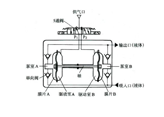 气动隔膜泵是以压缩空气为动力,通过膜片往复变形造成容积变化的容积泵,其工作原理近似于柱塞泵。