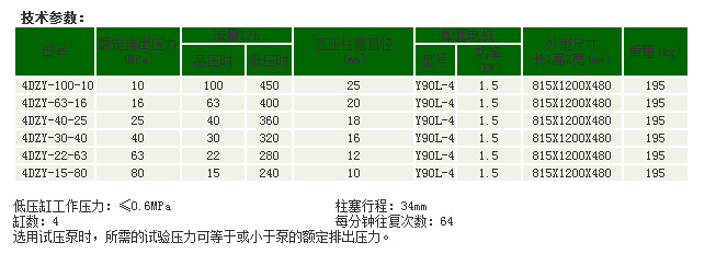 本泵系按水压试验要求而特殊设计。在试压的初始阶段(四缺工作)能迅速充液和升压,以缩短试验时间。具有较大的流量。当压力超过1.6Mpa(此压力可以调低)后,为使试压过程能较平稳而缓慢地进行。则流量自动减小,所以本泵在高、低时具有两种流量并能自动变换。凡在额定排出压力以下,可进行任意数值的水压试验。
