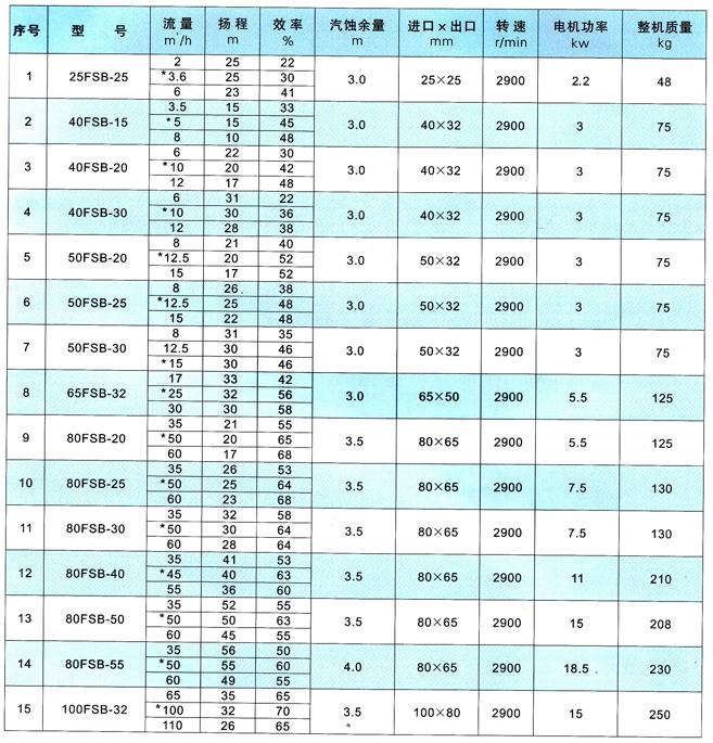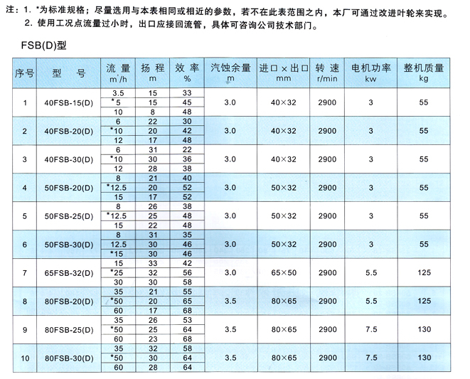 4、性能范围与型号说明:FSB型和FSB-L型系列耐腐蚀泵,流量范围1.5-100m3/时, 扬程范围10-50m。