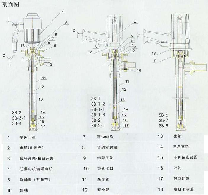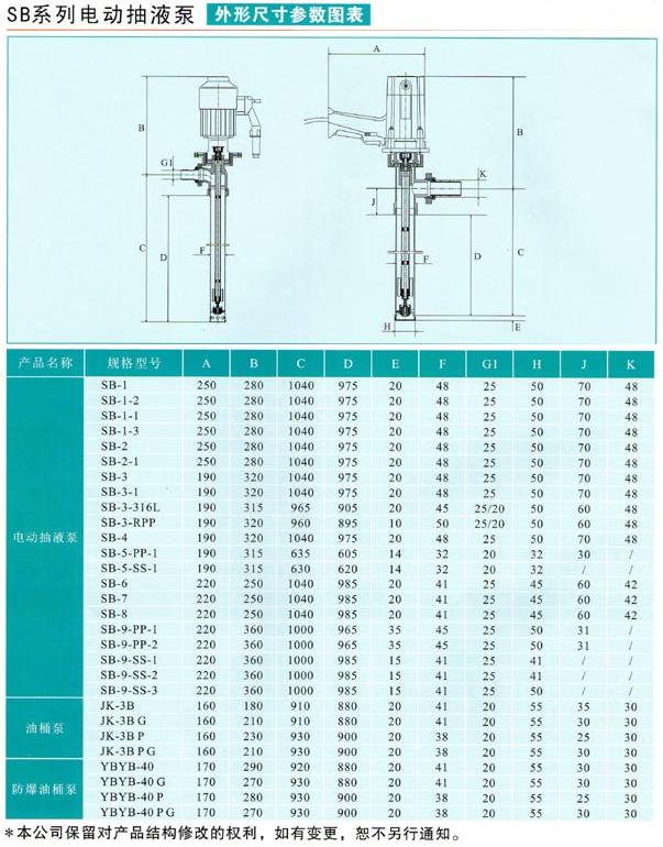 SB系列油桶抽油泵是我公司引进西德优质样机开发研制而成,各项技术指标均能达到样机水平,并在样机基础上开发了不同的使用场合不同抽吸液体的系列派生产品,该系列电动油桶泵为轻便型管式轴流泵,具有效率高,使用、维修方便等特点。手提式油桶泵广泛用于化工、石油化工、精细化工、染料化工、环保、水处理、医药、食品等部门抽吸不同液体。如在易燃易爆场合使用,可选用我公司生产的防爆型电动抽液泵;SB-3型、SB-4型)使用油泵时应按CB38361-2《爆炸环境用防爆电气设备》有关规定并正确使用防爆插头插座。抽油泵可以直接插入物料桶(最大适用于符合GB/325-1991标准的钢桶)中抽取桶中液体。可输送各种油料、带腐蚀性化学药水、其他液体。根据所输送的液体性质,电动油桶泵泵体沾湿部分材料可选用铝合金、不锈钢,316不锈钢等组成。驱动电机配备单相标准电机,防爆电机,高转速电机等多种选择。根据材质,电机不同,型号可分为: SB-1,SB-2,SB-3,SB-3-1,SB-4,SB-5,SB-6,SB-7,SB-8系列铝合金,不锈钢或防爆型。我们备有详细资料,欢迎索龋该系列泵可按防爆区域和非防爆区域选用,凡在防爆区域使用配置防爆型电机,这类电机分三种机组型号,当使用条件含各种易燃易爆混合时,应选用最高组级。该系列泵可输送酸、碱、盐、油品、饮料等介质,广泛用于化工、石油化工、精细化工、染料化工、环保、水处理、医药、食品等部门。同时适用于中小型油田、油库、炼油厂、加油站、农机站、企事业单位、车队、车辆船舶等输送汽油、煤油、柴油、轻质燃油的理想工具 .