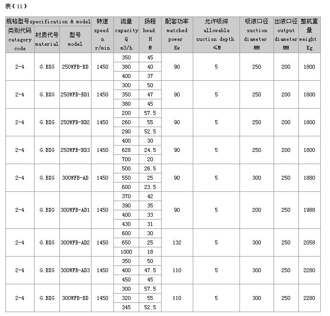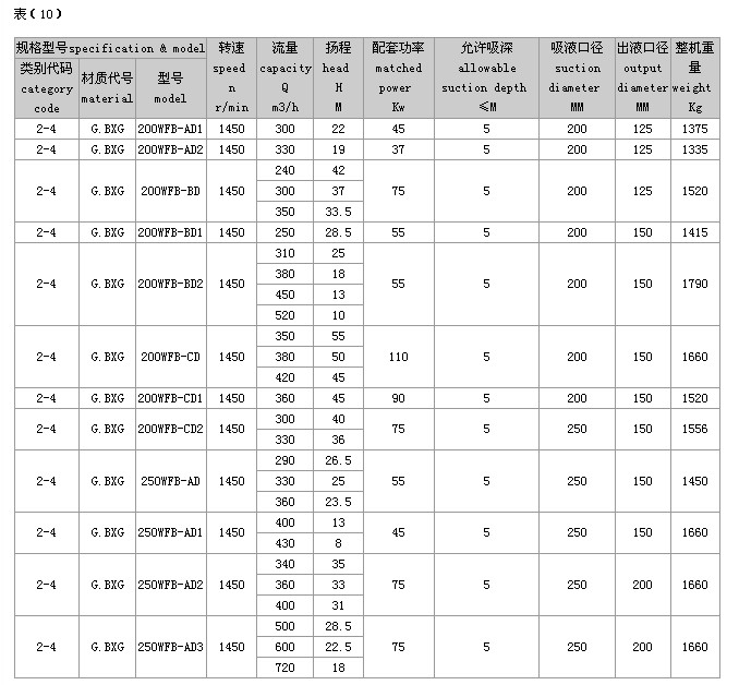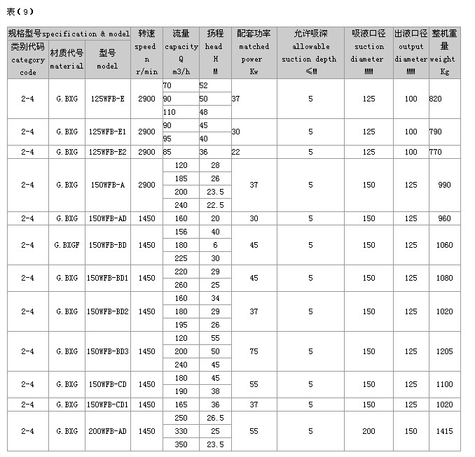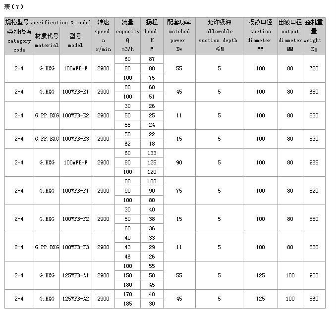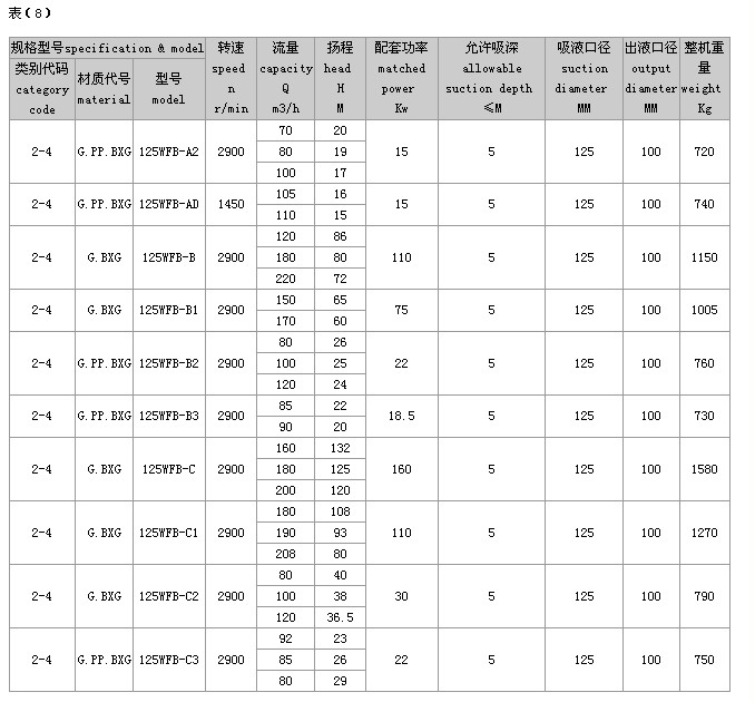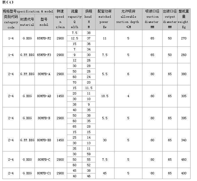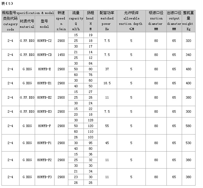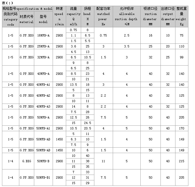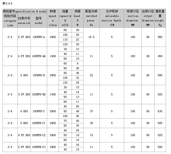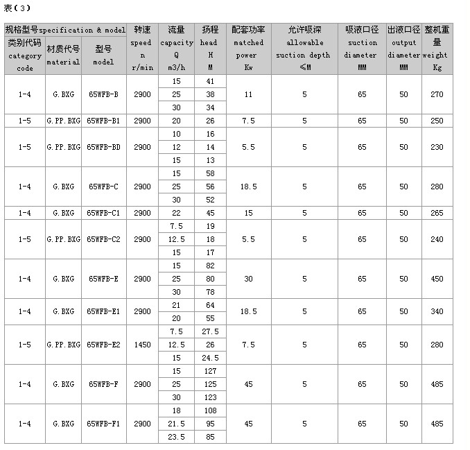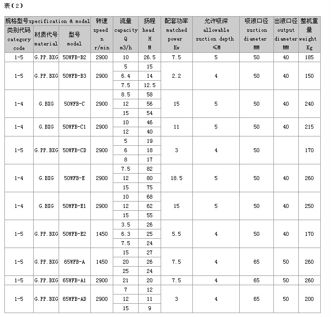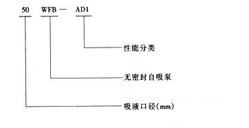 (2)完整的型号书写方式。假设水泵的要求是:造型为推车移动型,材质为增强聚丙烯,吸液口径为50mm,性能分类为AD1。这台水泵的完整型号为“5PP50WFB-AD1”