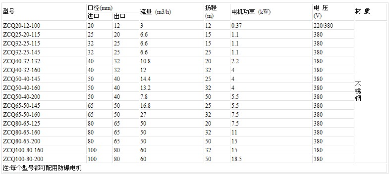 2. ZCQB型泵体及过流部件的材质与ZCQ型相同外,配用防爆电机,以适合输送带有腐蚀性的易燃、易爆液体。